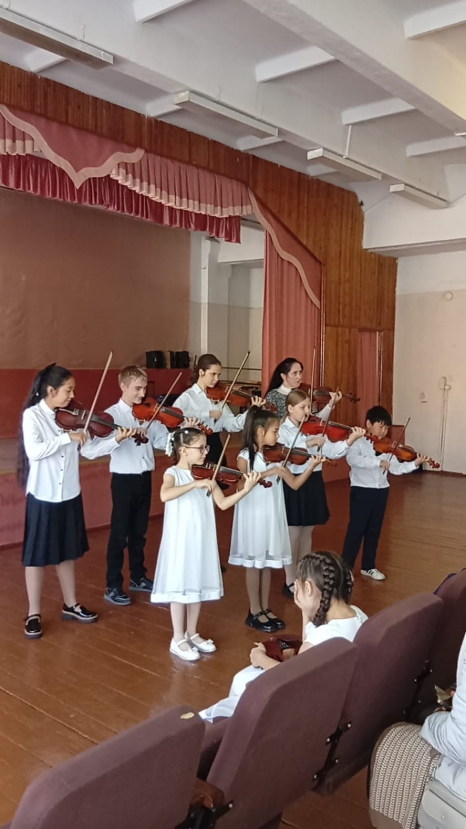 Ансамбль скрипачей «Violino», под руководством преподавателя, исполнил песни советского времени «Наш край» Д. Кабалевского и «Учат в школе» В. Шаинского.