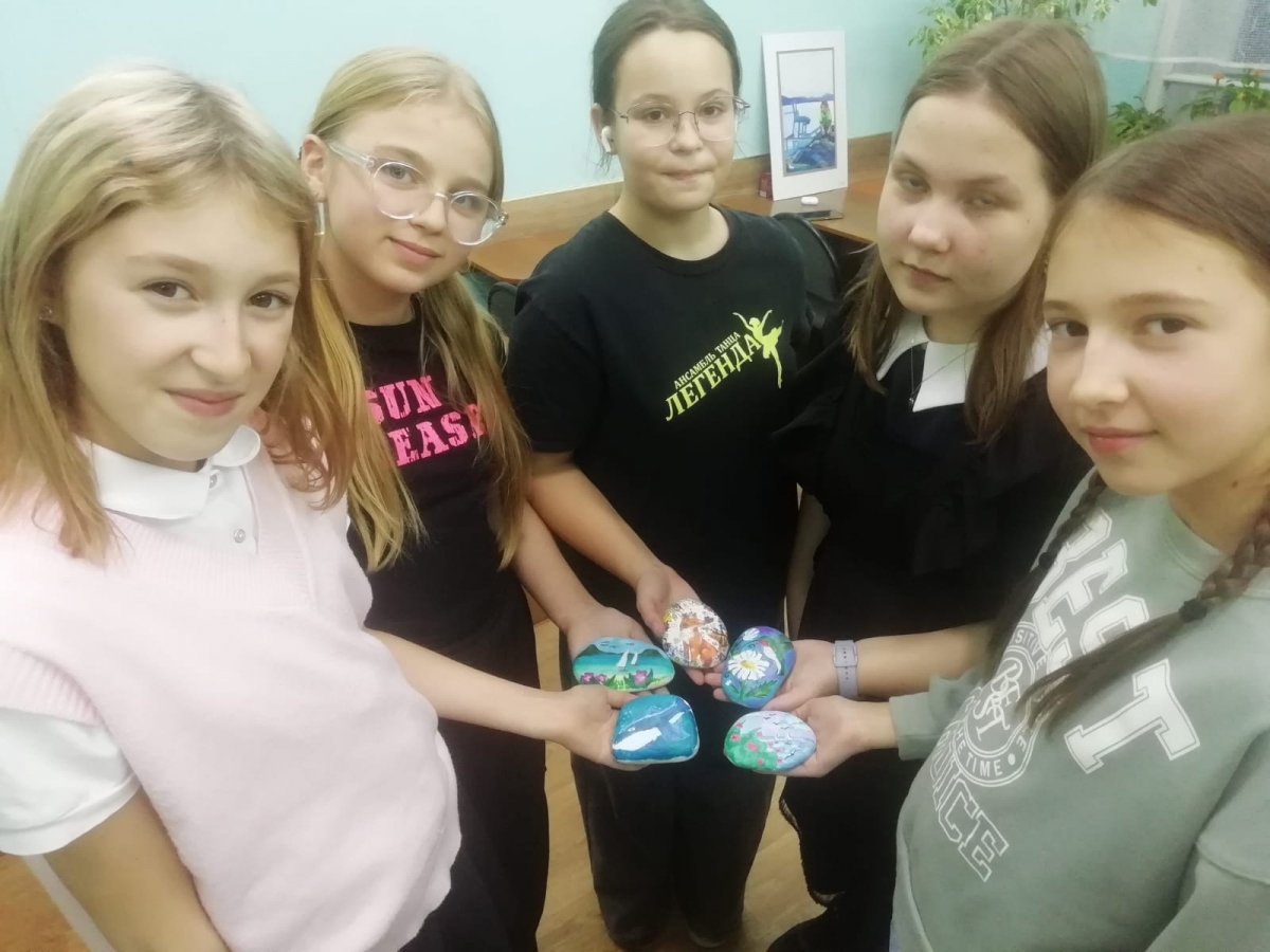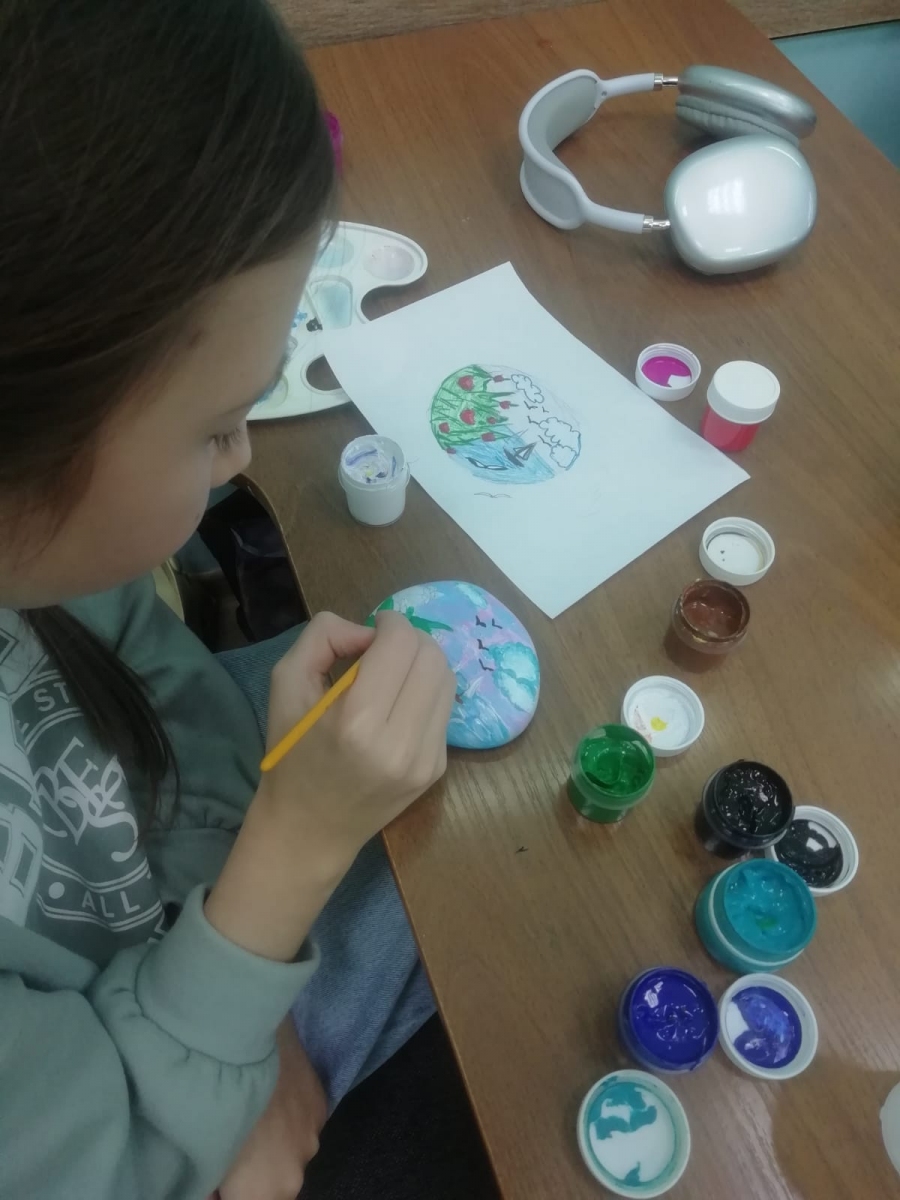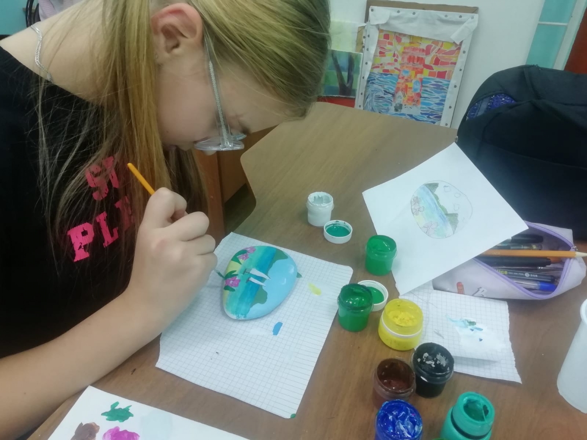 Юные художницы погрузились в мир декоративно прикладного творчества: они расписывали природные материалы — камни и раковины. Каждая участница заранее подготовила собственный эскиз, который затем воплотила в жизнь.