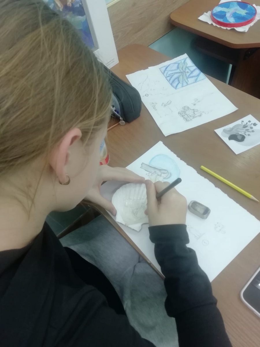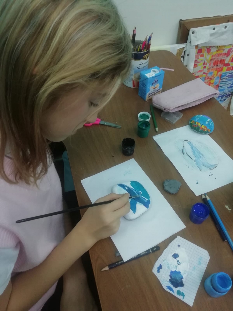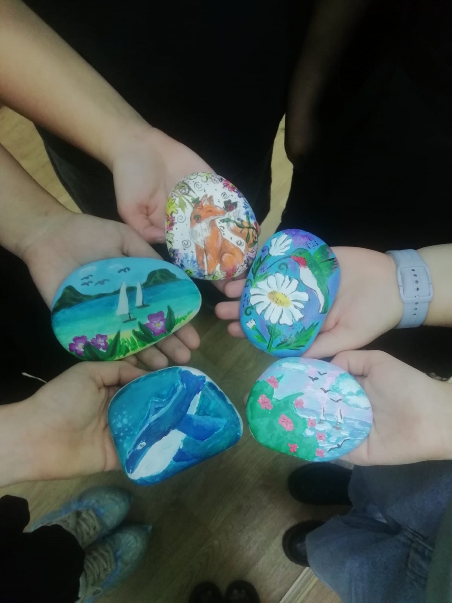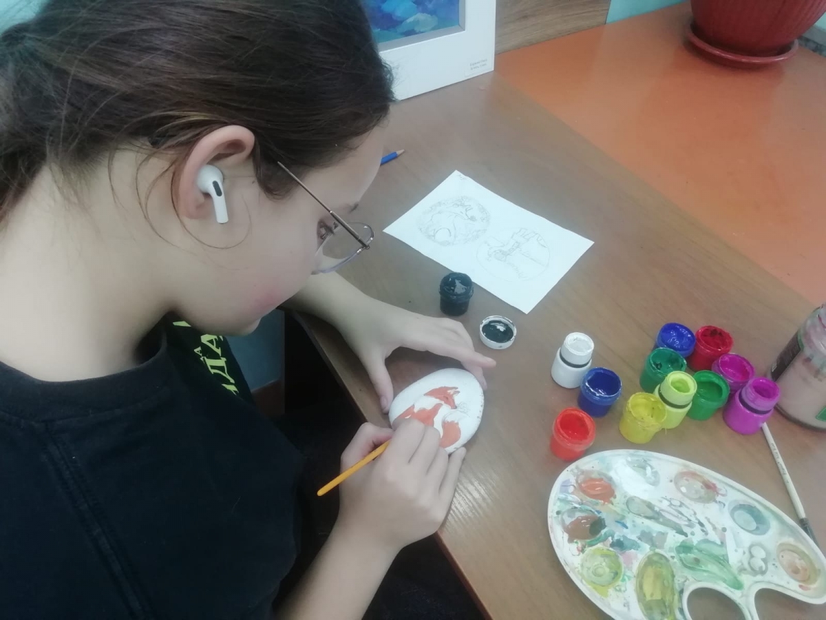 Юные художницы погрузились в мир декоративно прикладного творчества: они расписывали природные материалы — камни и раковины. Каждая участница заранее подготовила собственный эскиз, который затем воплотила в жизнь.
