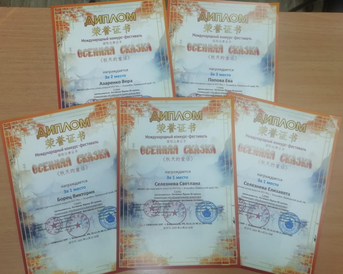Поздравляем учащихся 1 класса ДПИ‑отделения (преподаватель — Логинова И. И.) с блестящими результатами на международном конкурсе‑фестивале «Осенняя сказка»!