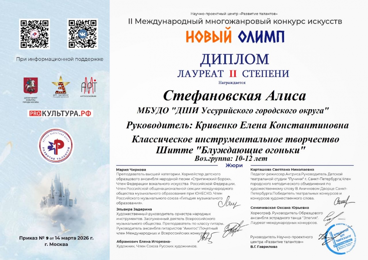 Учащаяся фортепианного отделения Стефановская Алиса преподаватель Кривенко Е.К. стала лауреатом Международного конкурса "Новый олимп" (Москва).