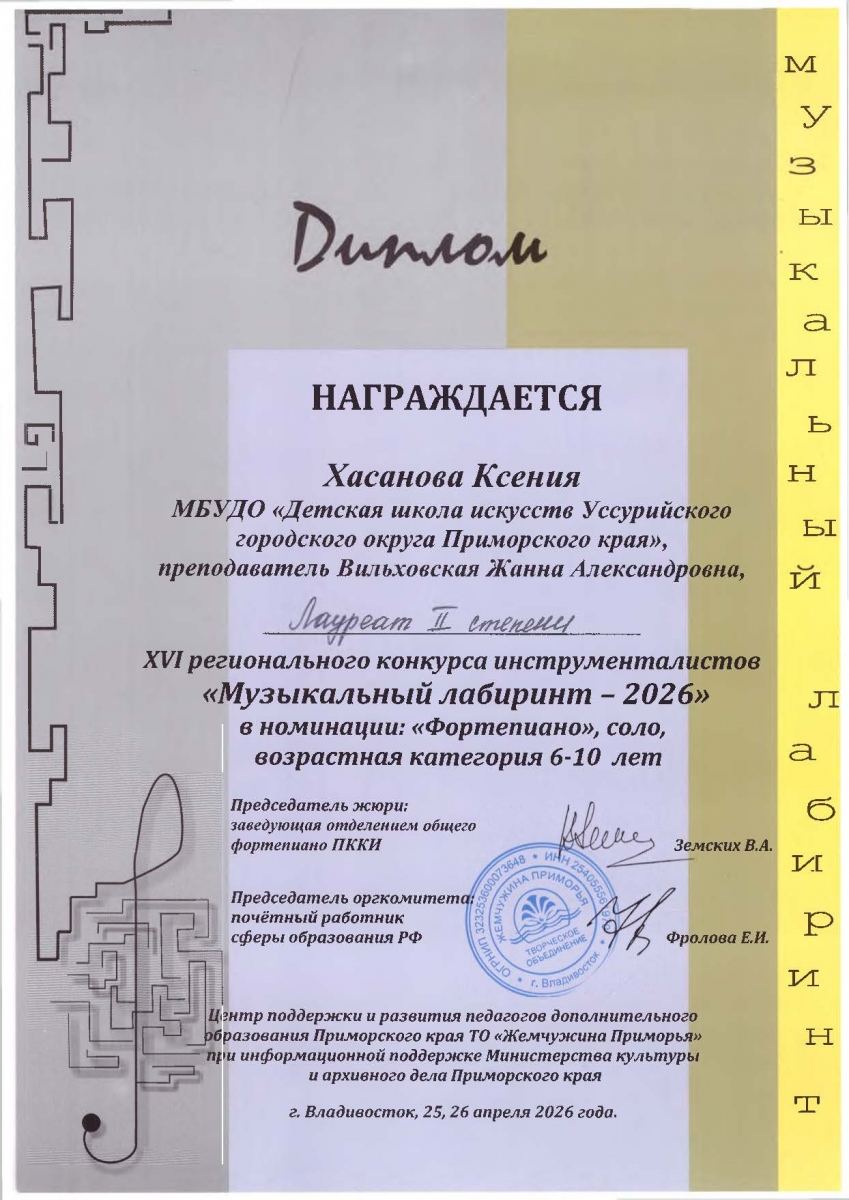 - Хасанова Ксения — лауреат II степени (фортепианное отделение);