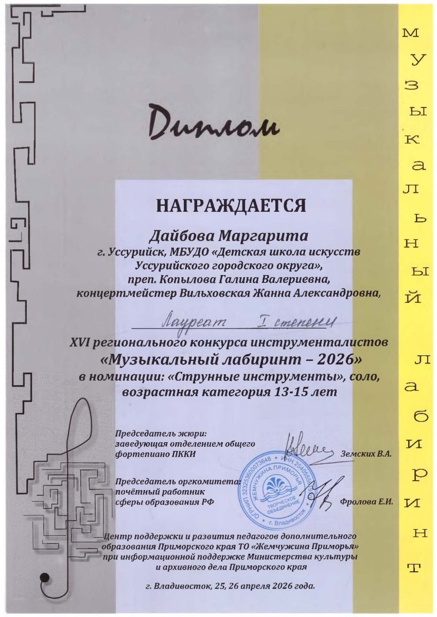 - Дайбова Маргарита — лауреат I степени (фортепианное отделение), преподаватель — Копылова Галина Валериевна (скрипка).